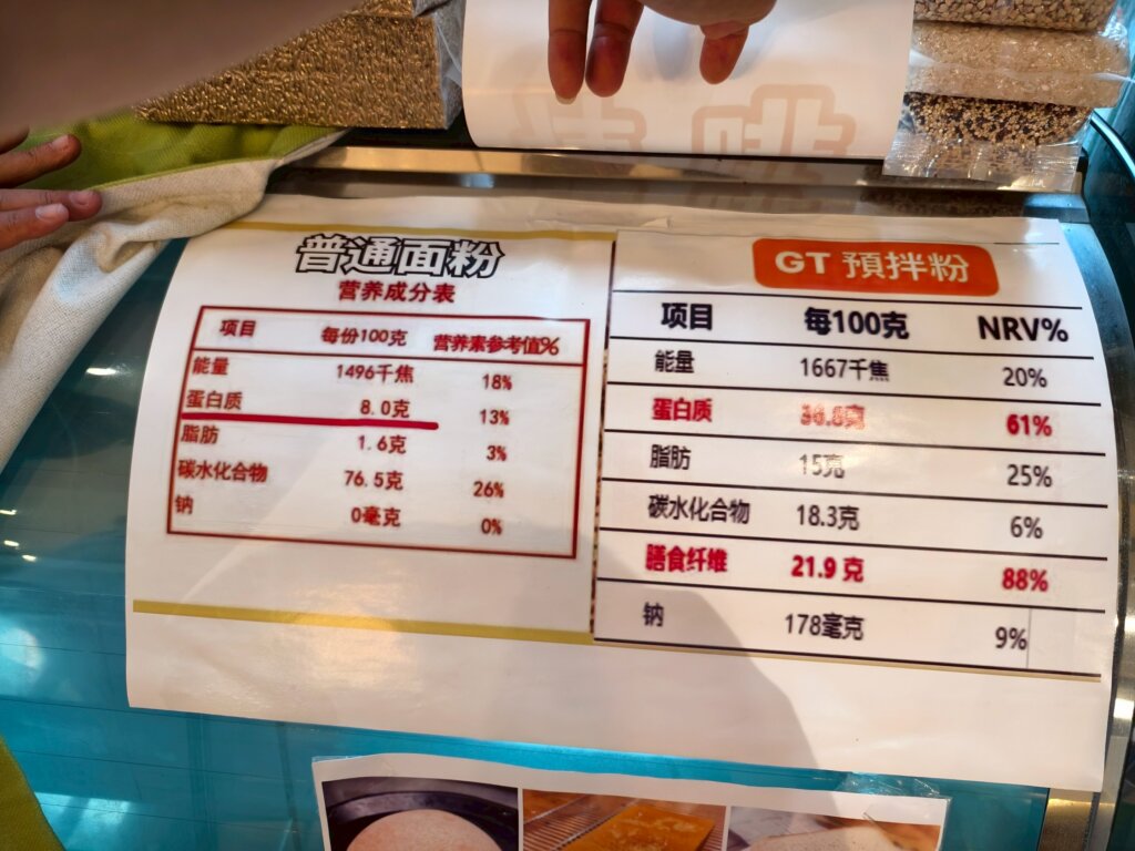 參訪當日,品牌代表向學術聯盟成員展示了其開發的營養產品「GT預拌粉」,並進行成分與市售麵粉的營養數據對比。根據現場資料,GT預拌粉每100克含有30.6克蛋白質與21.9克膳食纖維,遠高於一般麵粉的8.0克蛋白與0克纖維。這項配方為追求高蛋白、低碳飲食者提供了新選擇,亦對慢性病患者與特殊營養需求族群具高度應用潛力。